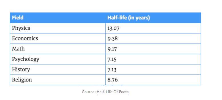 Câu trả lời chính là, tri thức có thời gian bán rã, y như chất phóng xạ [3]. Nghĩa là sau một khoảng thời gian T, tri thức còn cần thiết phải giữ lại chỉ còn một nửa.